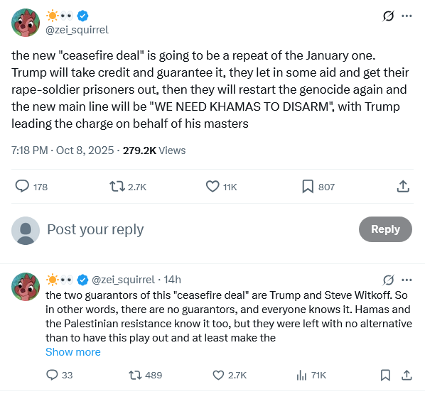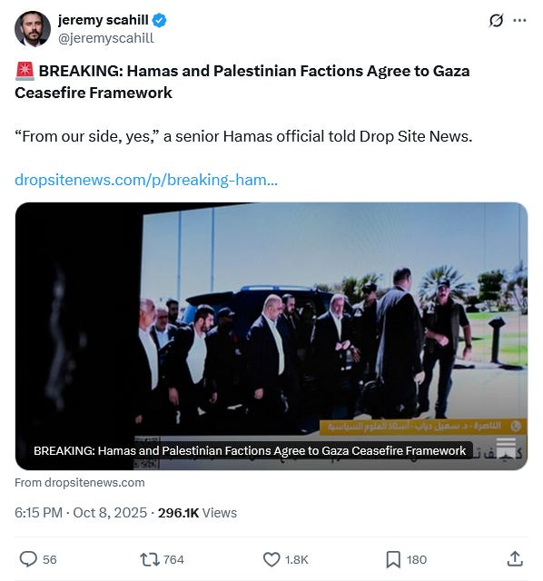 “Hamas and Palestinian Factions Agree to Gaza Ceasefire; Trump Confirms Deal Was Reached“ (Scahill).