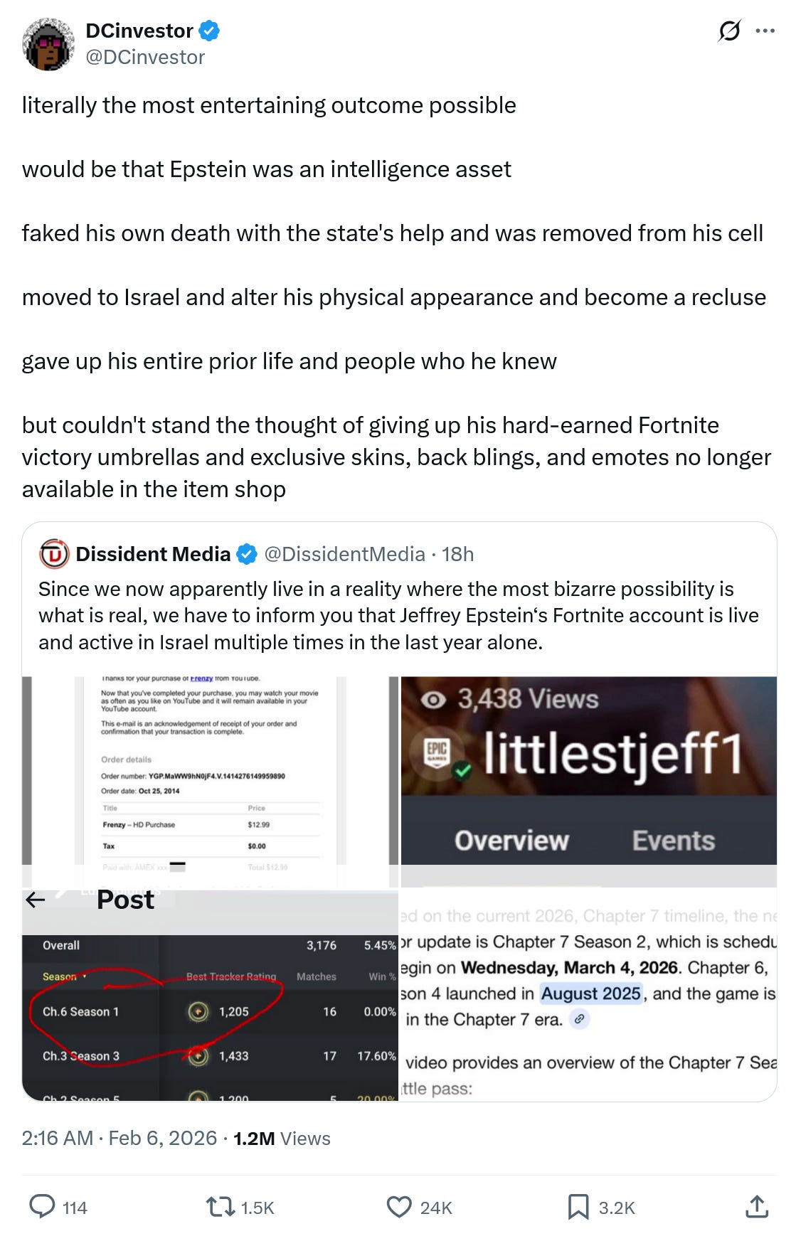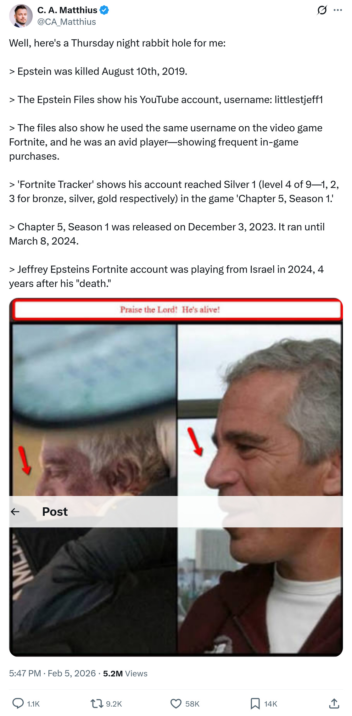 “Epstein Death Gets Weirder: DOJ Finally Admits To ‘Orange-Colored Shape’ Moving Up Staircase“ (Durden). Presumably released now to back up the shady case for murder. Why wouldn’t the Mossad extract him, if only as a power move to demonstrate they could? He was a very, very successful agent. They don’t leave any Jew behind. They had, and have, 100% control of the entire US government, and this extraction would be a piece of cake.