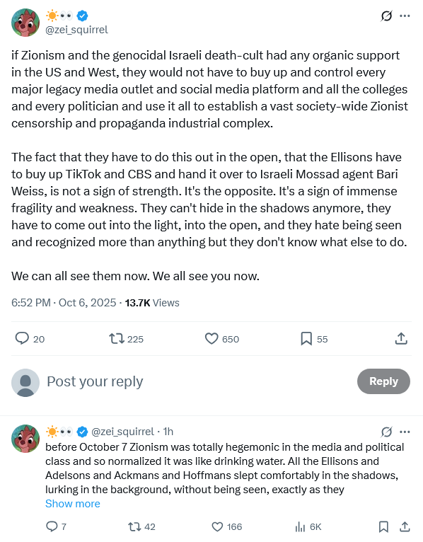 “New CBS owner David Ellison met with top Israeli general in scheme to spy on Americans“ (Reed/Blumenthal).
