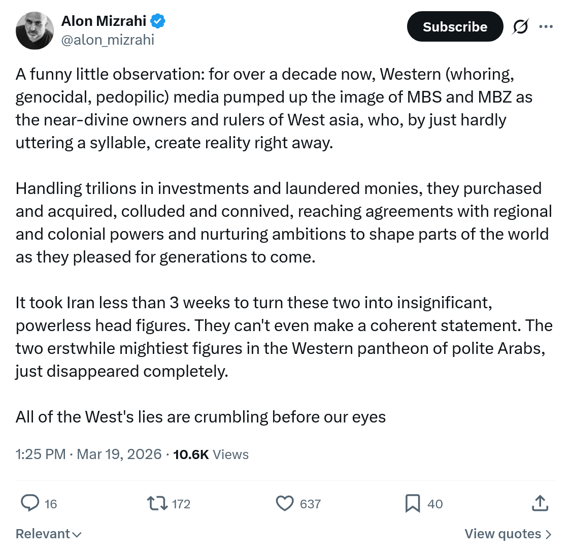 The deal was that these princelings could steal a considerable amount of the wealth of the people in return for using their connections - US and ‘Israel’ - to provide security to the people. Now, not only have these connections not provided security, they are a real and present danger to both the wealth of the countries and the people living therein. It is long past time for a change:
