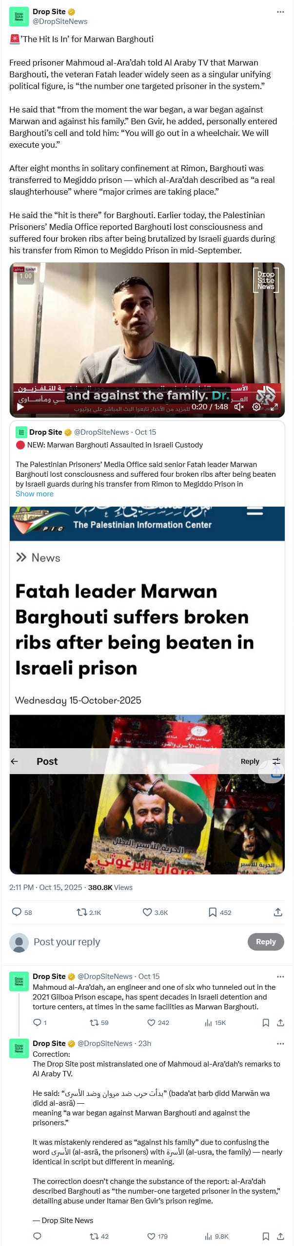 “Breaking news and analysis on day 741 of the Gaza genocide | The Electronic Intifada”. Interview with Helena Cobban. Elmer at 1:26 on the history of prisoner swaps. Followed by Abunimah comments on Marwan Barghouti and the Zionist ideal of Marwan Barghouti. Followed by Winstanley’s analysis of Trump’s recent cryptic remarks.